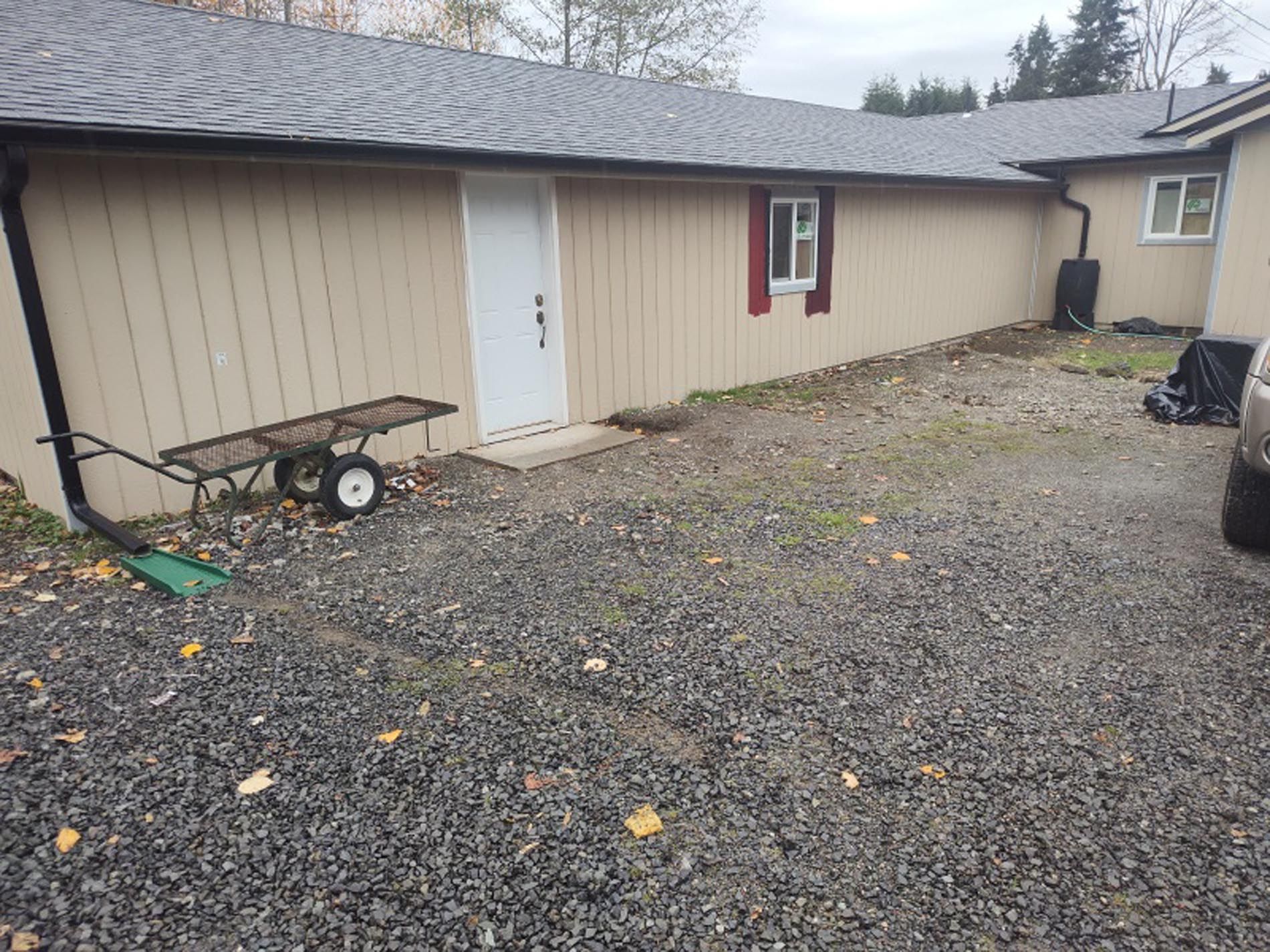 A house with a gravel driveway leading to it
